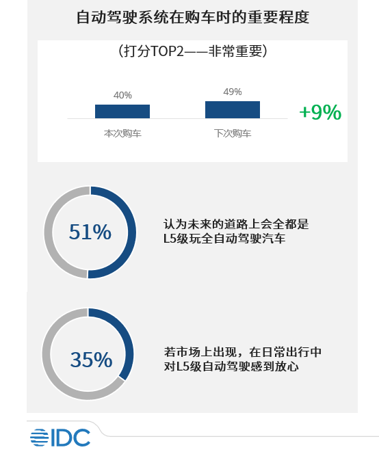 跟着L2级自动驾驭在我国商场的日益老练,顾客对自动驾驭的承受度随运用率日益提高。自动驾驭/驾驭辅佐功用正逐渐成为顾客购车时的重要考量要素。超越对折的顾客认可L5级自动驾驭的长时间远景,但仍然以为其安全性有待进一步验证。