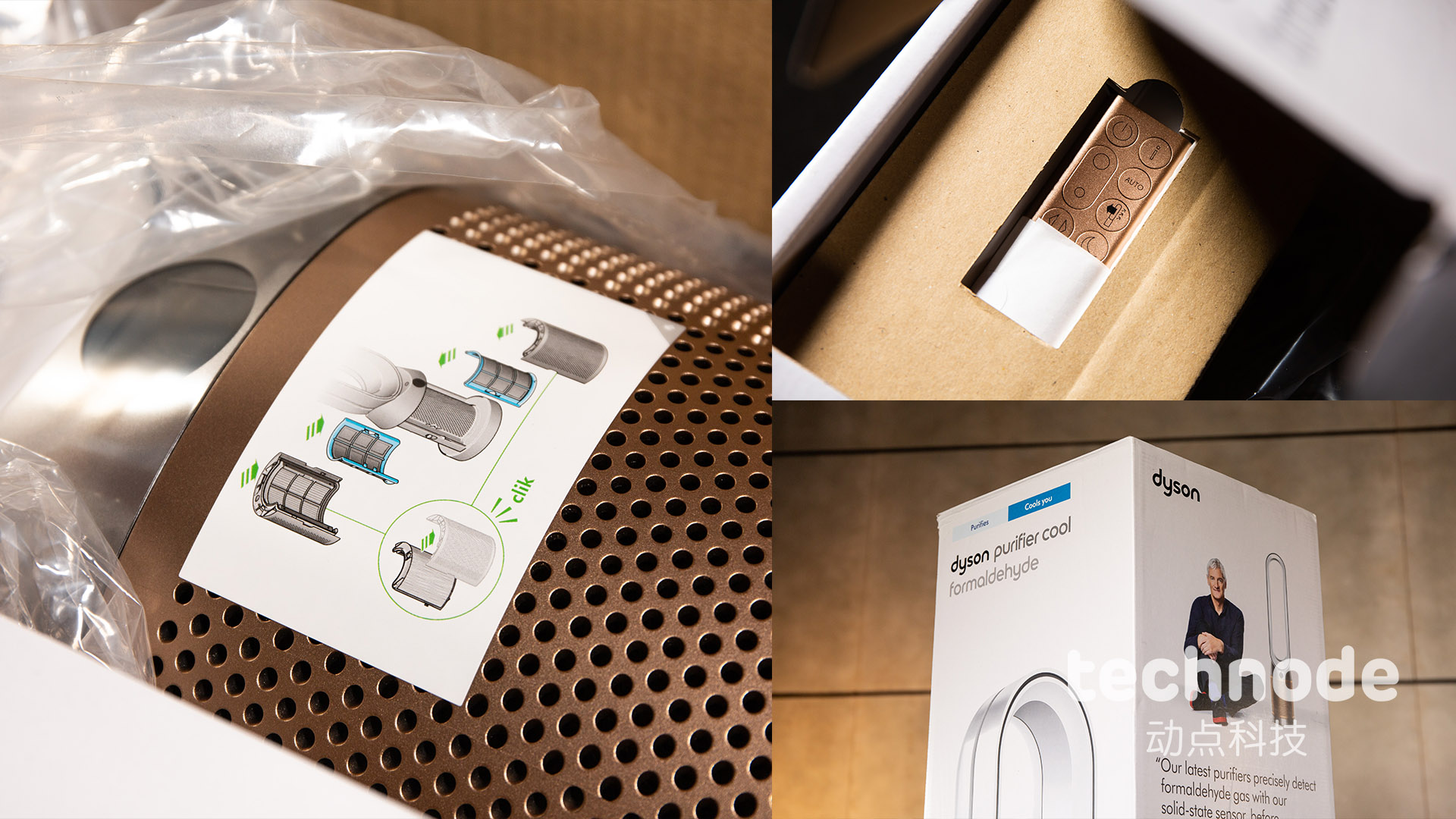 TP09仍旧沿用了戴森空气净化电扇的简练规划,动点科技拿到的这款为白金配色,高一米左右,宽大约20公分,出风的部位为白色,整个滤网外罩是金色,看上去十分高雅,合适融入今世家居风格。