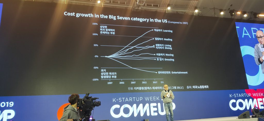 的主办方是Ministry of SMEs and Startups和Korea Institute of Start-up and Entrepreneurship Development,看上去是个政府驱动的创业活动——连韩国总理都到会。前两年从前来过,除了局面美丽,内容却很一般,所以这次收到COMEUP 2019的约请,其实最开端没什么感觉。可是,由于本来韩国很有名的立异峰会beSUCCESS的创办人James的约请,所以我也看了看COMEUP 2019的官网,在开场讲演嘉宾名单里却发现有不少是我知道的韩国朋友。这些朋友,有韩国闻名前期出资FuturePlay的Junghee Ryu,有在韩国运营7年的Sparklabs的Eugeue Kim等等,这些朋友的姓名呈现在日程最前面让我感觉有点古怪的原因,不是由于他们没有名望,而恰恰相反,便是由于他们都是十分“接地气”的韩国创业圈内十分有名望的人,按道理他们来政府大会就该是逛逛过场算了。所以,我最终决议去看看,所以早上7点从雅加达落地首尔,连酒店也没有来得及去9点就呈现在会场了。COMEUP 2019 第一天的开场仪式也让我眼前一亮,韩国分担中小企业和创业公司的政府官员,带着一群韩国本地的闻名企业家、出资人穿戴COMEUP的卫衣一同进场。有了这些真实的业界专家的参加(讲演嘉宾、创业公司都是这些人来约请),这场大会的主题天然变得十分明显: Meet the Future。其挑选的八大职业也很接地气,不再泛泛而谈:移动(Mobility), 食物(Food), 文娱(Entertainment), 时髦和美容(Fashion&Beauty),金融(Fintech),生物和健康(Bio&Health), 前沿科技(Frontier Tech),教育和生活方式(Education&Lifestyle)。