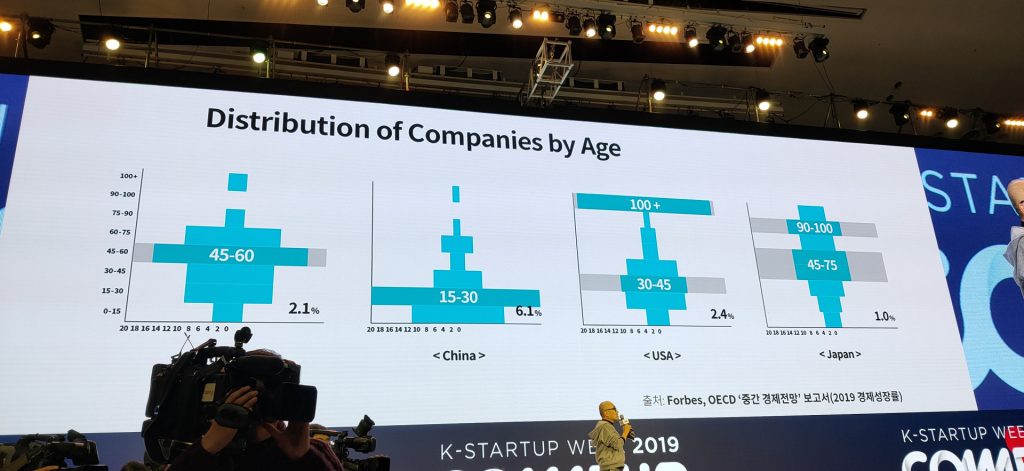 Bongjin也共享了他对韩国在未来立异方面的观点。关于现在韩国立异遇到的问题,他比较了全球几个首要商场中企业的的建立时刻。我国公司的前史大部分都是15-30年,所以十分年青化;日本的公司前史会集在45-75年,百年老店也许多;他以为美国的状况最为健康,有百年老店而大部分在30-45年也相对老练;而反观韩国大部分公司都会集在45-60年,韩国却需求更多的年青公司。