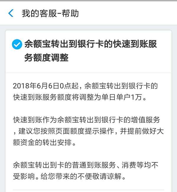 发布的一则公告得悉:从6月6日0点开端,余额宝转出到银行卡当日快速到账额度有所调整,从每日限额5万元调整到1万元,转出到银行卡普通到账服务(第二天到账额度)及消费付出等均不受影响。调整之后,从余额宝里转出金额超10000元,要想2小时内就能到账,怕是再也完成不了了。但从揭露数据看,余额宝户均金额仅为3000多元,所以调整对绝大部分用户没有影响。