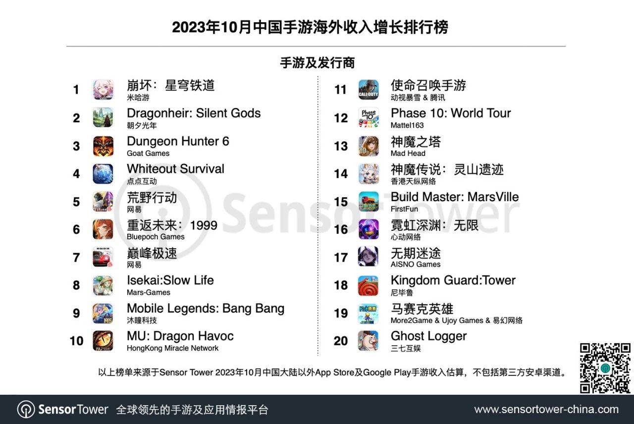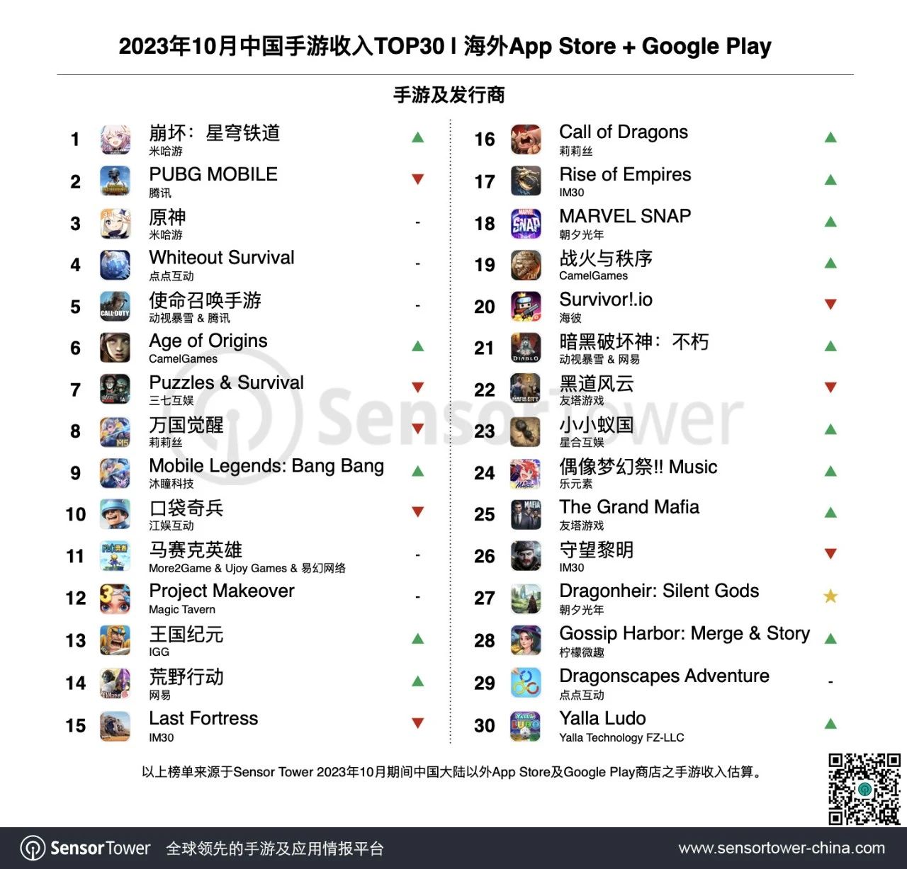 Sensor Tower商铺情报渠道发布了2023年10月我国手游产品在海外商场收入及下载量排行榜,具体榜单改变如下。